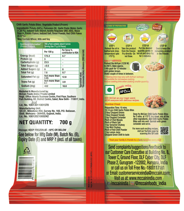 McCain Chilli Garlic Potato Bites Nuggets Net Qty: 700 g